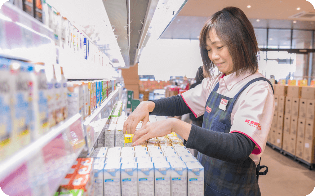 品出し業務の最中、お客様から商品の場所を聞かれることがよくあります。その場所までお客様を案内しながら、何気ない会話をする時間が楽しいです。商品を棚に並べながら気になる商品を見つけたり、夕食のメニューを考えたりすることも。現在は週4日、8時半〜13時半の1日5時間勤務で、無理なく働けています。退勤時にはほぼ毎回買い物をして帰っており、とても便利です。