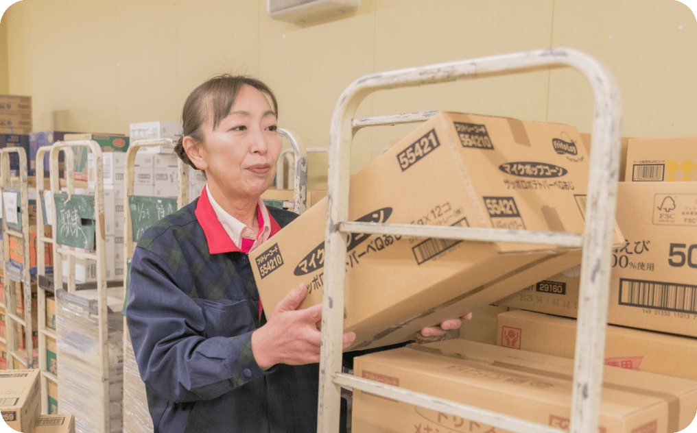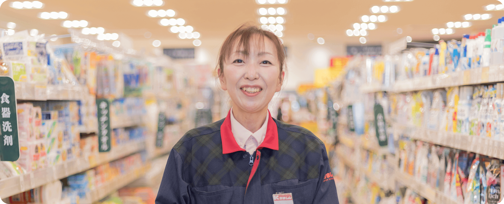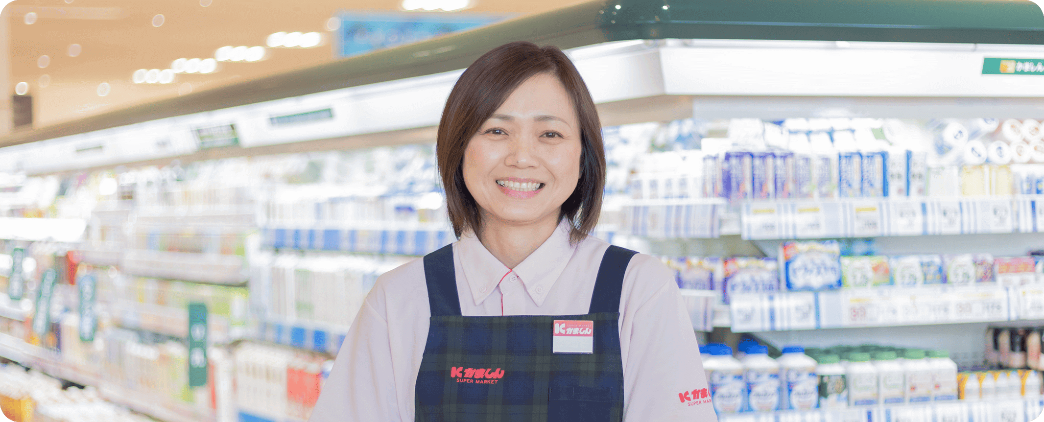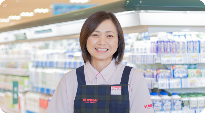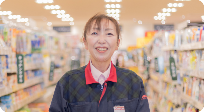 店舗のリニューアルオープンに伴うスタッフ募集チラシがきっかけで、入社を決めました。最初に任された仕事は品出しやピッキング。入社前は体力に自信がありませんでしたが、仕事をしながら程よく体を動かしているうちに体力が付き、いつのまにか健康的にダイエットが成功していました。家族からも「かましんで働き始めてからイキイキしているね」と言われるようになり、自他ともに変化を実感しています。現在は水曜と土曜以外の週5日、8時〜16時半の1日7.5時間勤務です。希望休が取りやすく、気持ちよく休めます。