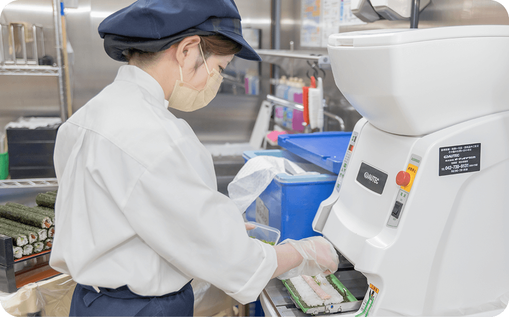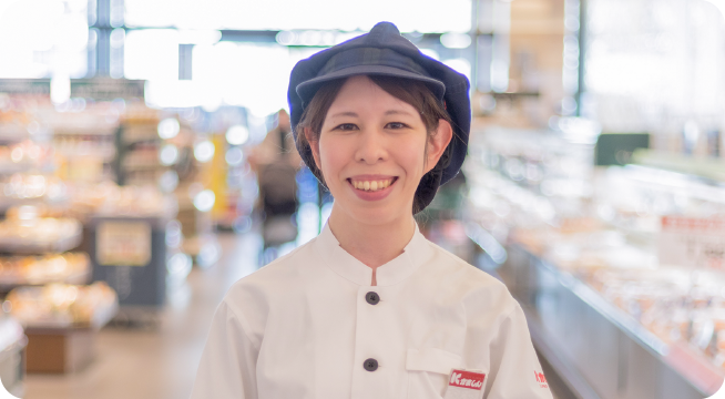 総菜部門で、お寿司やお弁当の製造を担当しています。前職でも調理業務をしていましたが、かましんでは機械を活用する工程も多く、確立されたレシピもあるので、より効率的な調理ができるようになりました。鉄板を使っただし巻き作りなど、家ではなかなかできない調理の機会もあり、楽しさを感じます。集中するとつい黙々と作業をしがちですが、ここではスタッフ同士がコミュニケーションを取りながら仕事をしていて、居心地がいいです。