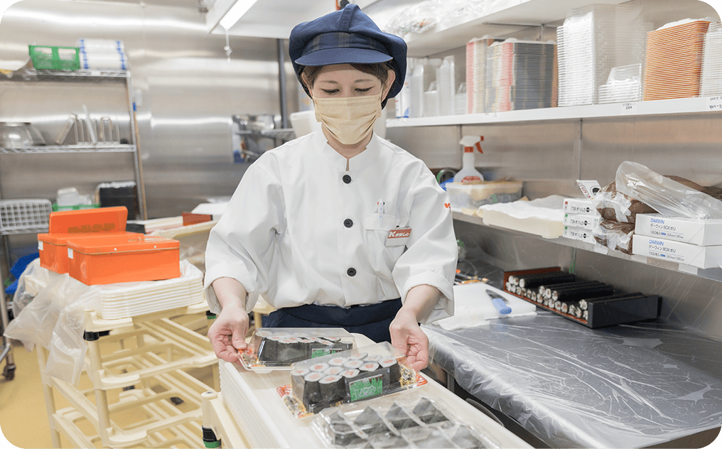入社当初の担当はお弁当のみでしたが、徐々に生寿司、巻き寿司など、任せてもらえるメニューが増えてきました。パートスタッフが担当するメニューは各々固定で決まっているものの、個人の意欲や適性に応じて業務の幅を広げていけるので、やりがいにもつながっています。現在は土日を含めた週5日、8時から16時までの1日7時間勤務です。かましんの作業場は広くて整理整頓が徹底されており、快適で働きやすい環境が整っています。