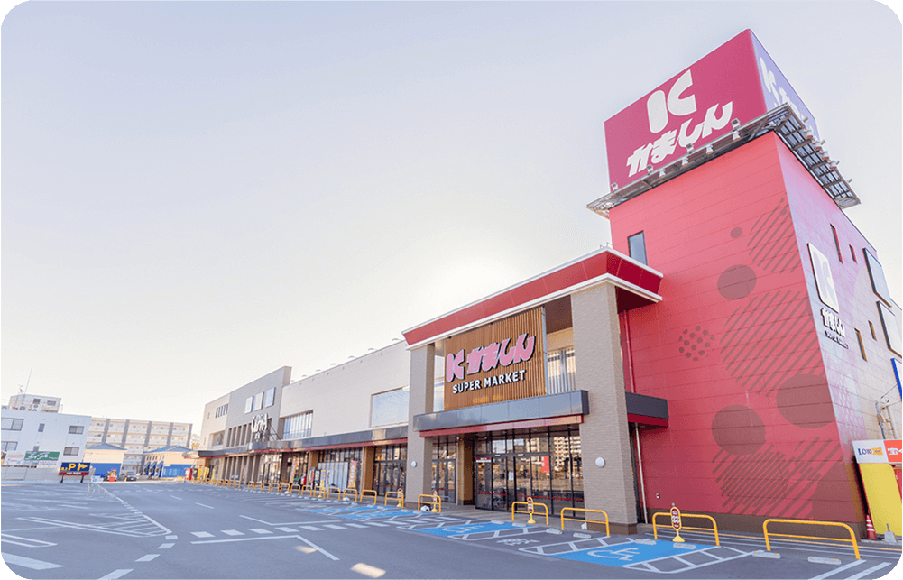 従来の単独店舗の出店に加え、近年ではドラッグストア・100円ショップ・衣料品などの専門店を併設したNSC(近隣型ショッピングセンター)での出店が増加中。かましんで主に扱っている商品は、あくまで「普段の生活に必要な食品」。お客様の利便性を高めて集客を増やすため、買い回りの頻度が高く、生活を支えるうえで相性の良い業態を選び、「CarnA(カルナ)」というNSCとして出店しています。立地条件に沿って出店可能な店舗スタイルを検討し、最適な方法を常に模索しながら進化を続けています。