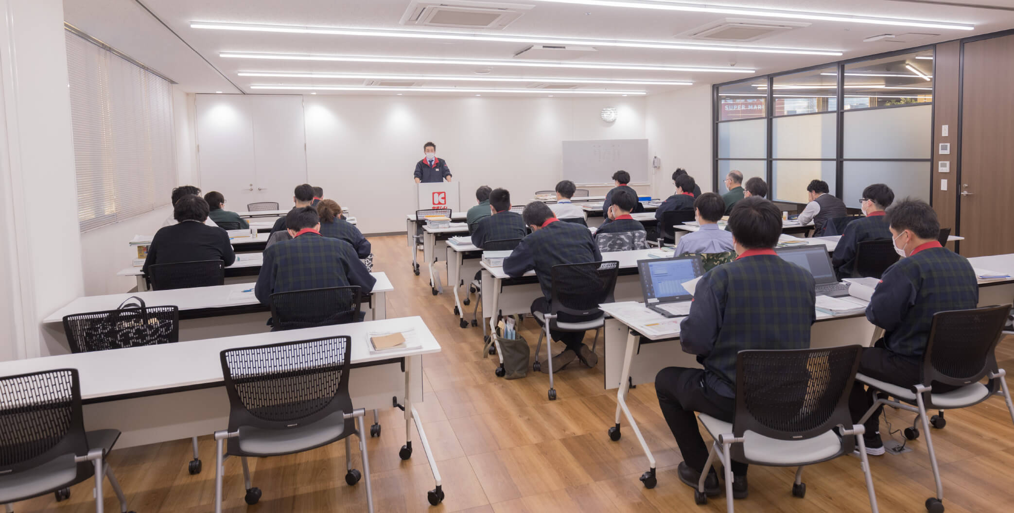 かましんでは「教育」を会社経営の根幹と位置づけ、力を入れています。資格等級・役職に対応した研修制度を整備しており、社内研修はもちろん、かましんが加盟しているAJS(オール日本スーパーマーケット協会)主催の研修にも参加。常に「その時に必要なこと」を学べる環境があります。